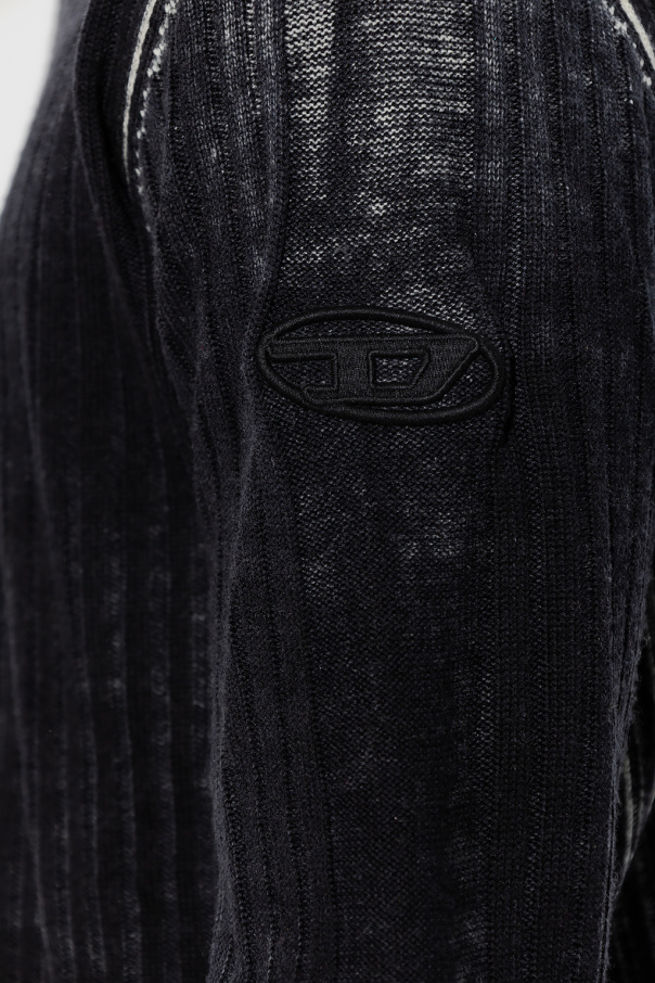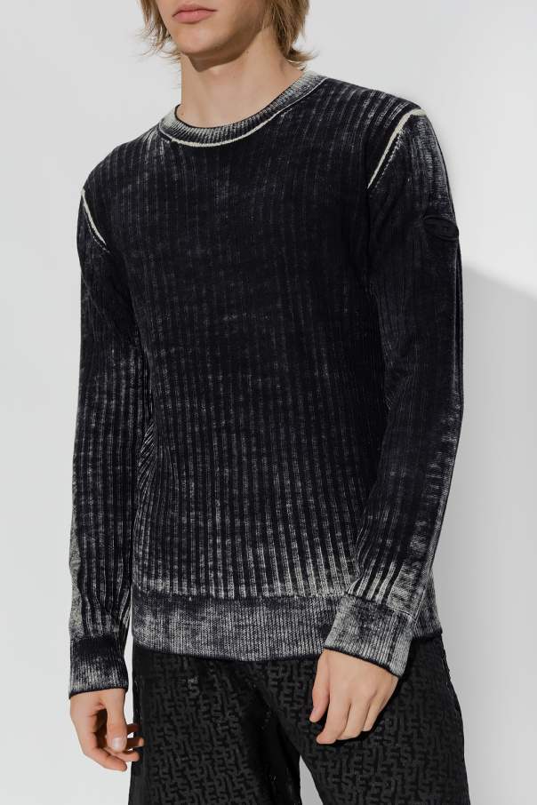 Black and gray ‘K-ANDELERO’ sweater from Diesel. Made of wool, this garment features a stripe pattern and vintage effect.