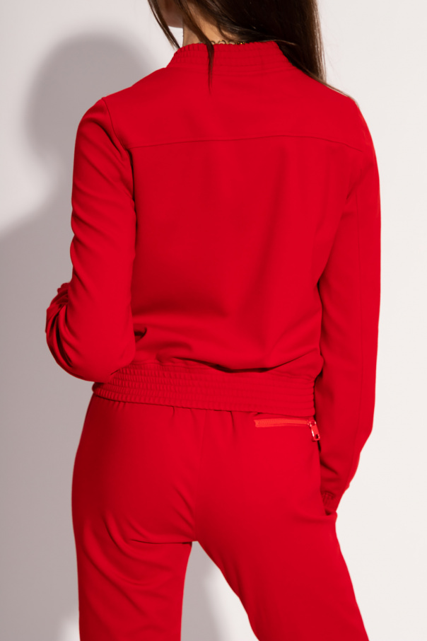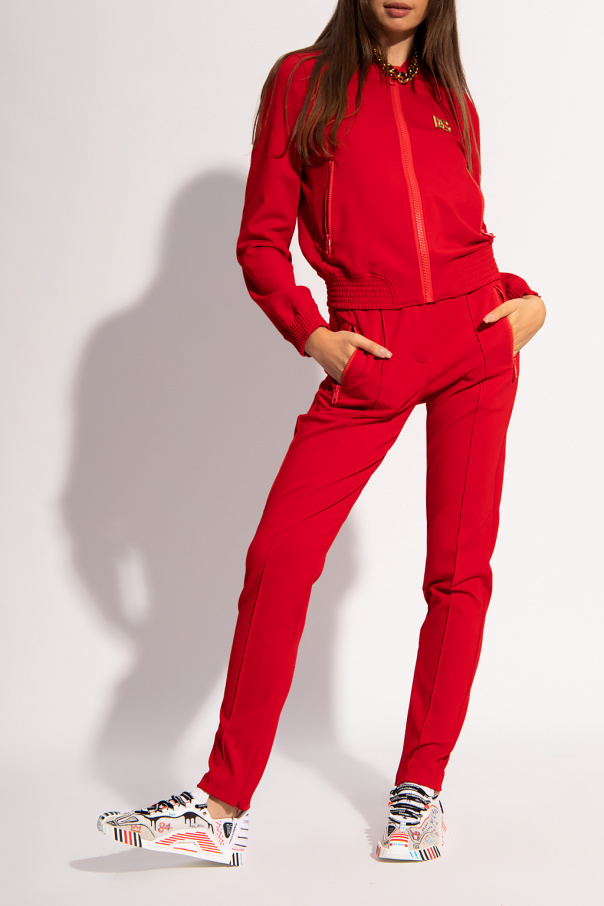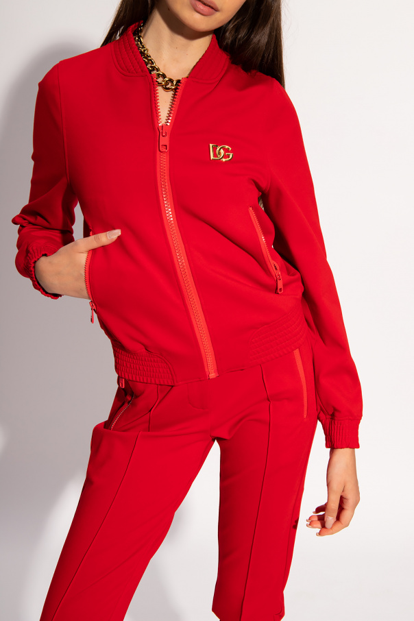 Red jacket from Dolce & Gabbana. Emblazoned at front with a gold-tone logo plaque, this style features a zip fastening and two zipped pockets.