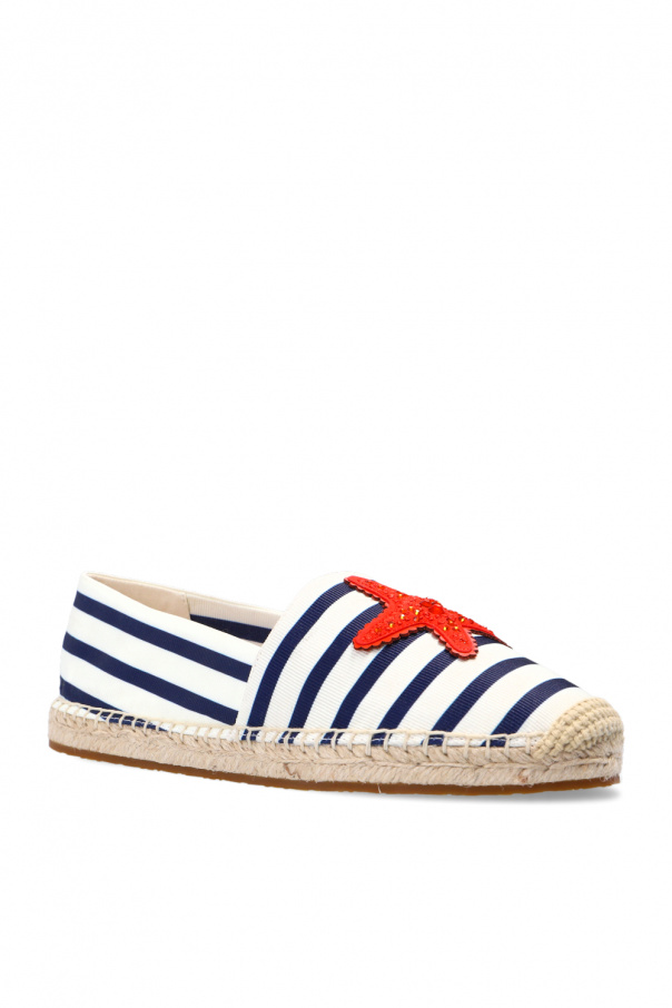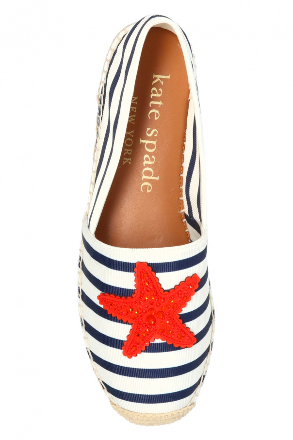 Navy blue, white and beige 'Uptown Stripe' espadrilles from Kate Spade. Enriched by all-over stripes and an orange appliqué, this canvas-crafted pair sits on a brown rubber sole.