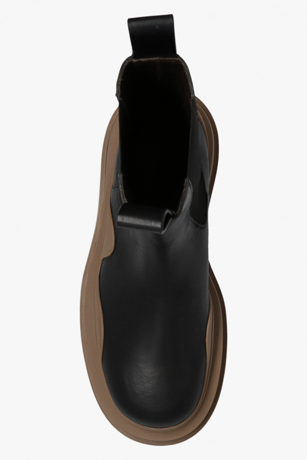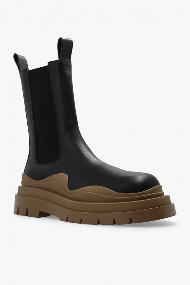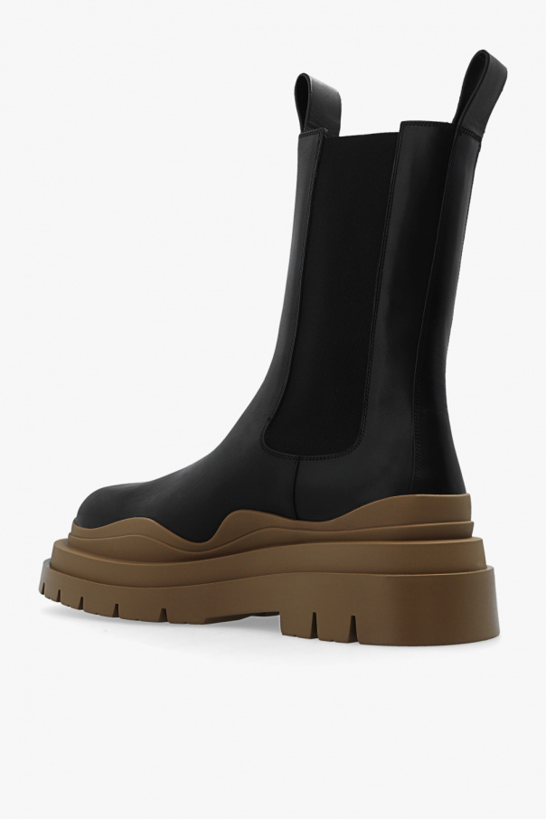 Black ‘Tire’ ankle boots from Bottega Veneta. Made from leather with a slip-on silhouette, this model features elastic panels on the sides and a chunky sole in brown rubber.