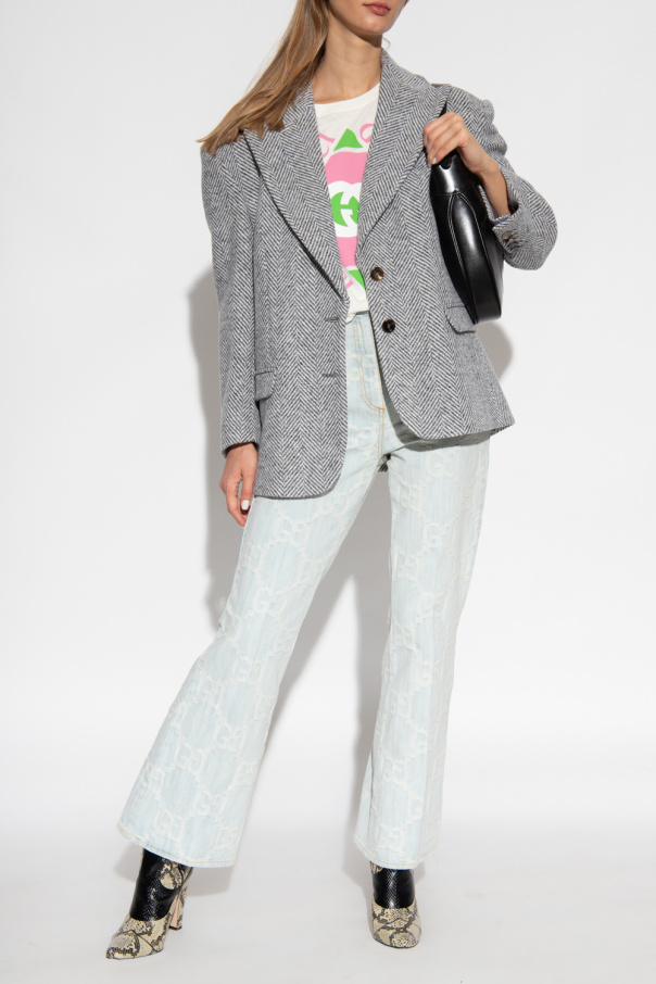 White crewneck T-shirt from Gucci. Crafted from cotton, this style features short sleeves, an elasticated collar and a green, pink and white logo print inspired by the '80s graphics on the front.