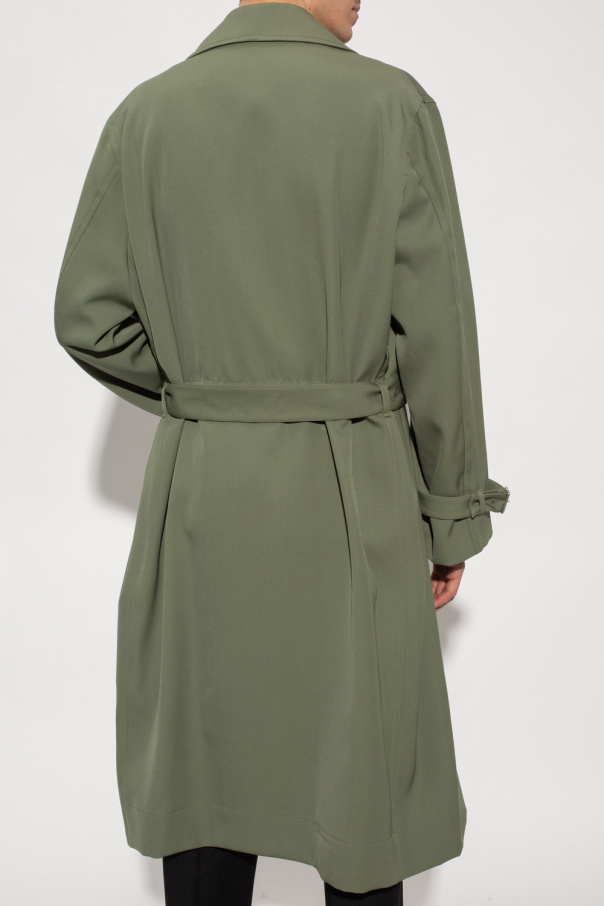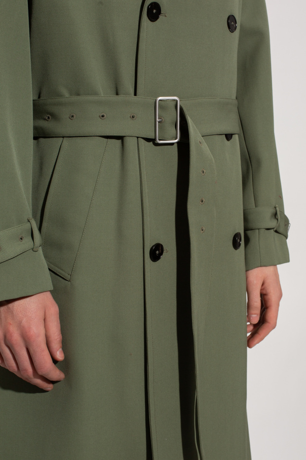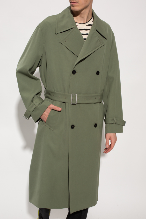 Green trench coat from Jil Sander. Made of wool with a double-breasted silhouette, this style features button fastenings, long sleeves, two frontal pockets and a waist-cinching buckle belt.