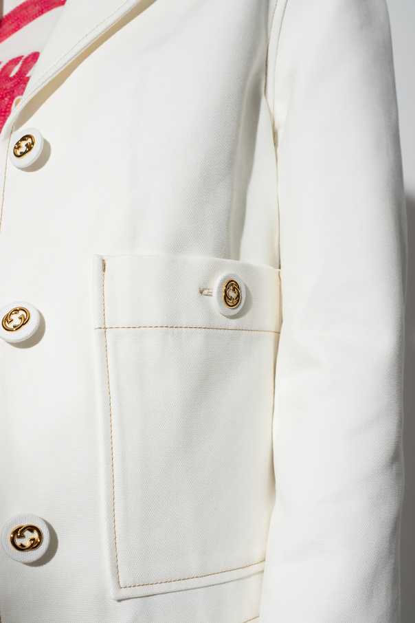 White jacket from Gucci. Made of cotton, this garment features decorative Interlocking G buttons in gold-tone, notch lapels, two buttoned pockets and long sleeves.