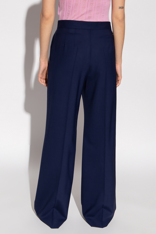 Navy blue trousers from PS Paul Smith. Made of wool, this pair falls with wide legs and features a zip fly with hook & eye closures, pleat detailing and two side seam pockets.