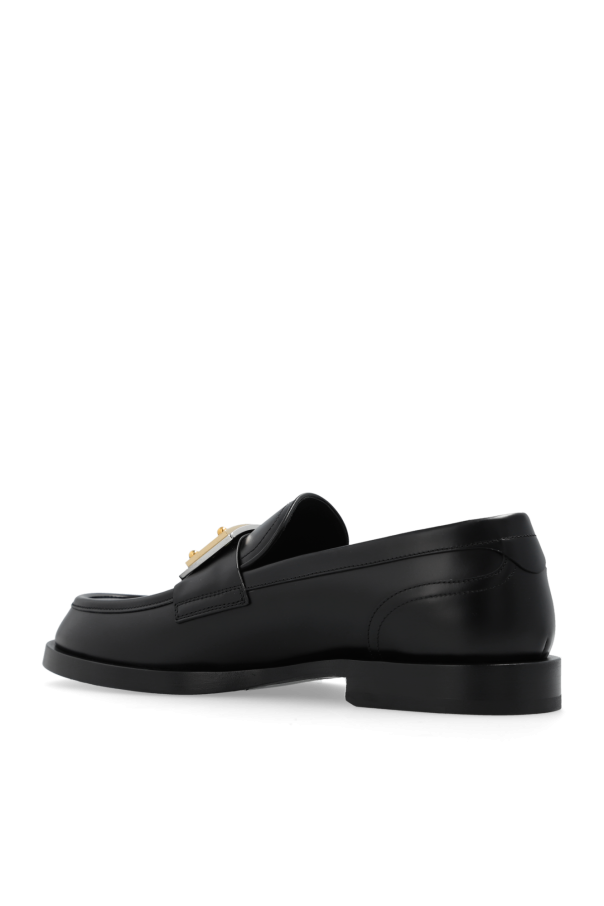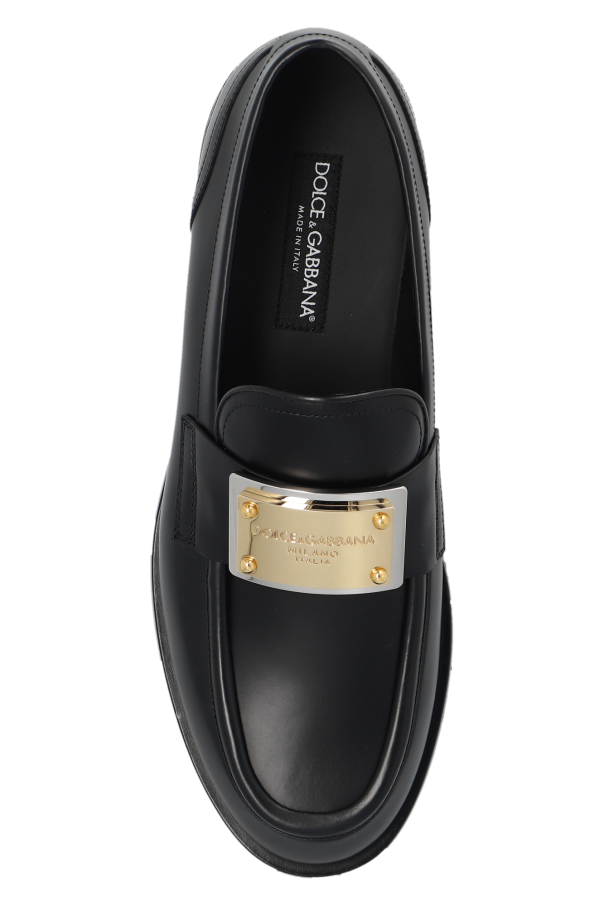 Black loafers from Dolce & Gabbana. Made of smooth calf leather, this pair features gold- and silver-tone appliqués with an engraved logo on the front and a black leather sole.