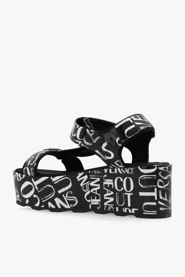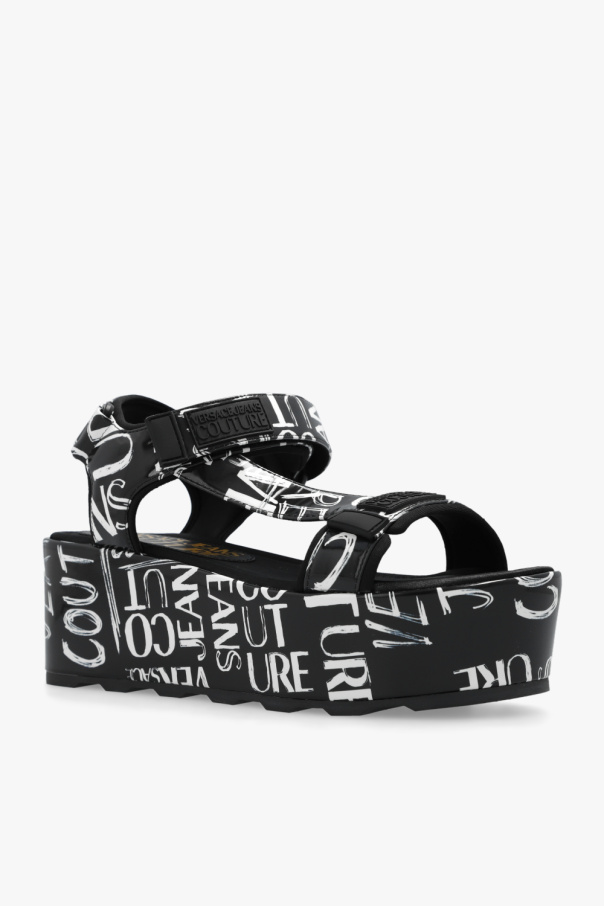 Black ‘Mallory’ platform sandals from Versace Jeans Couture. Crafted from faux leather, this model sits on a black rubber sole with a glossy faux-leather overlay and showcases a white monogram print, velcro closures and rubber logo patches.
