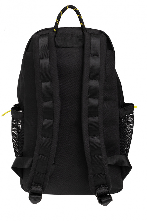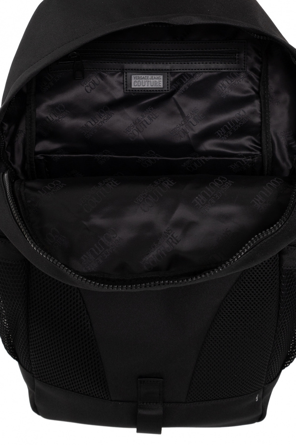 Black backpack from Versace Jeans Couture. Fastened with a two-way zip, this model features a white logo print, two zip pockets, mesh side pockets with drawstrings, top handle, adjustable shoulder straps, neon green elements and one internal compartment with three slip pockets and one zip pocket.