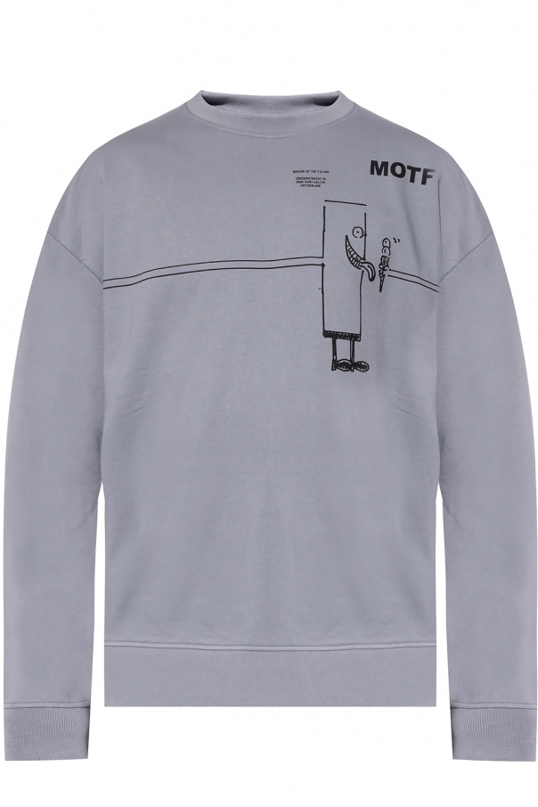 Grey crewneck sweatshirt from Acne Studios. Crafted from cotton jersey, this style features a black graphic print with the brand\'s logo on the front and ribbed finishes on the bottom hem and cuffs.