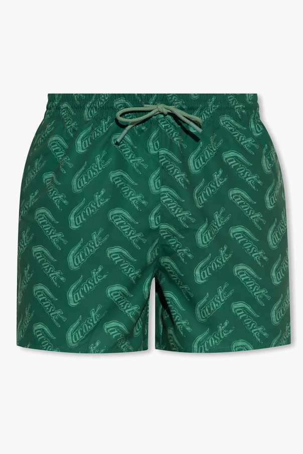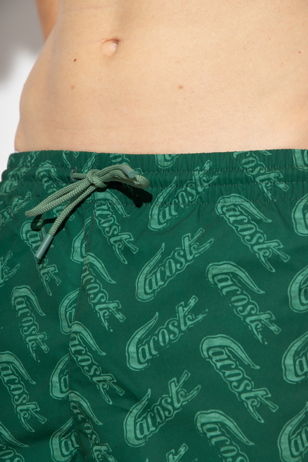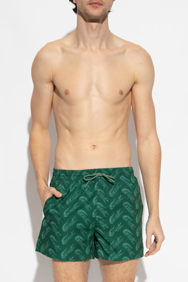Green swim shorts from Lacoste. Crafted from recycled materials, this pair is complete with an elastic drawstring waistband, logo pattern and three slip pockets.