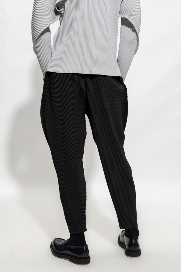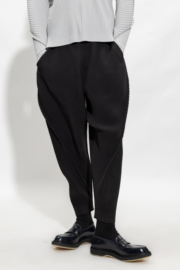 Black trousers from Issey Miyake Homme Plisse. Crafted from ribbed material, this pair falls with wide cropped legs and features an elasticated waistband and two frontal slip pockets.