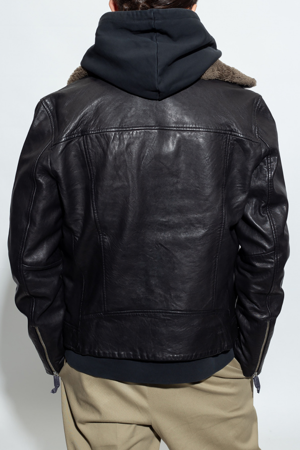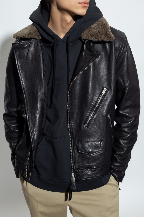 Black ‘Baltic’ biker jacket from AllSaints. Made of lamb leather, this model fastens with a two-way zip and is complete with a detachable lamb fur collar, three zip pockets, one snap-fastened pocket and zipped cuffs.