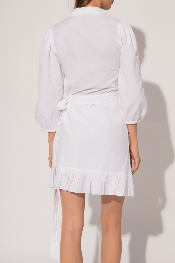 White ‘Paige’ beach dress from Melissa Odabash. Cut with a wrap-around silhouette, this style features a self-tie waist, a V-neckline, long sleeves and a ruffled hemline.