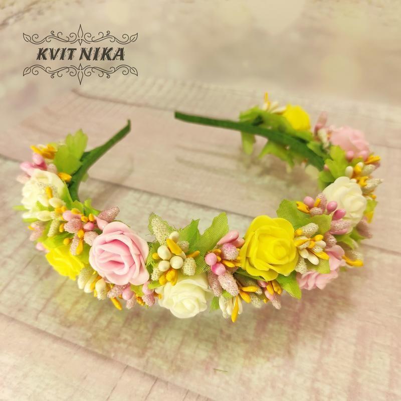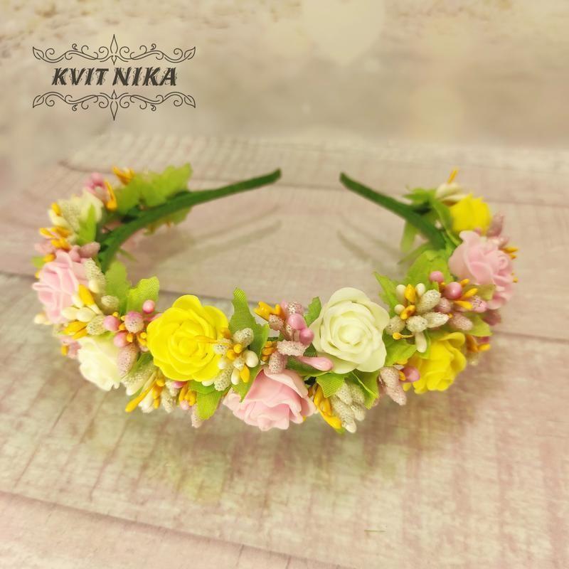 Нежный весенний ободок с нежно розовыми, белыми и желтыми розами из фоамирана с добавлением белых и нежно розовых тычинок. Веночек выполнен на металлическом обруче, обтянут тейп-лентой, которая надежно фиксирует все крепления. Обруч металлический очень надежный и имеет универсальный размер, подойдет как для малышки, так и для взрослой леди.