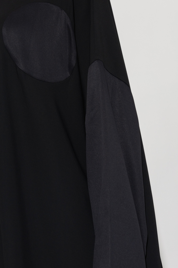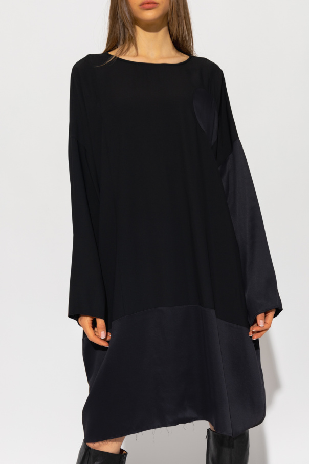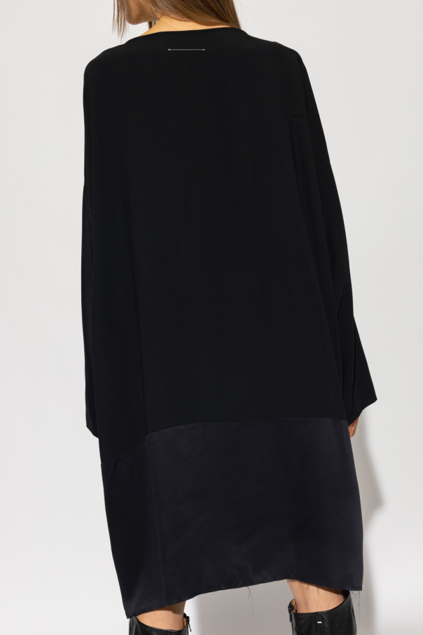 Black dress from MM6 Maison Margiela. Cut with an oversize fit, this style features a round neck, long sleeves, dropped shoulders, satin trims, two slip pockets and raw edges.