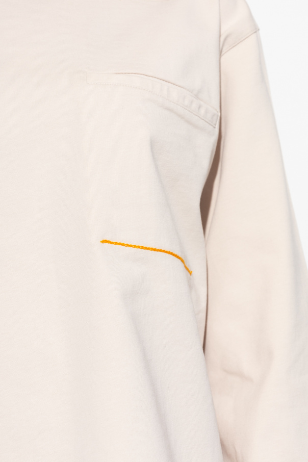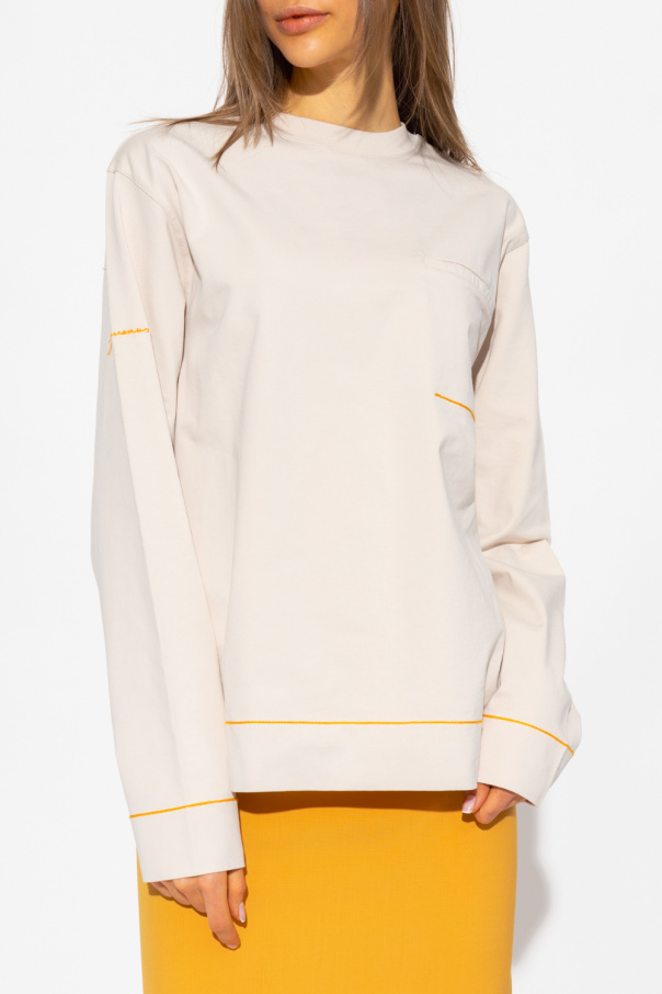 Light beige top from Jacquemus. Made of cotton, this long sleeve design features decorative orange stitching details, one slip pocket, round neck and long sleeves with a logo embroidery.