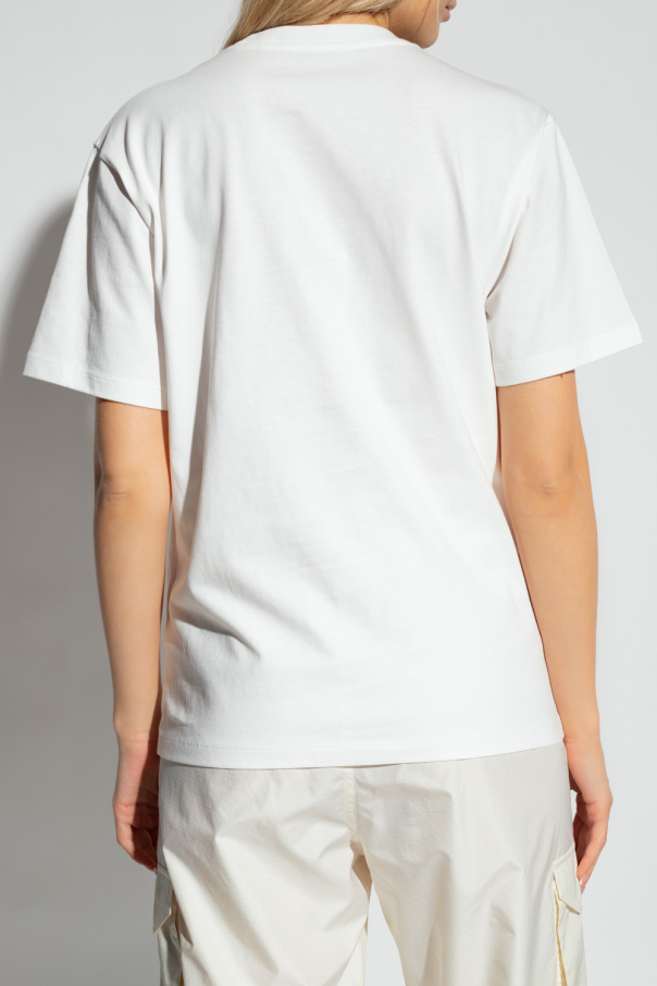 White crewneck T-shirt from Moncler. Crafted from cotton, this style features short sleeves and a metallic mirror print with the brand\'s logo.