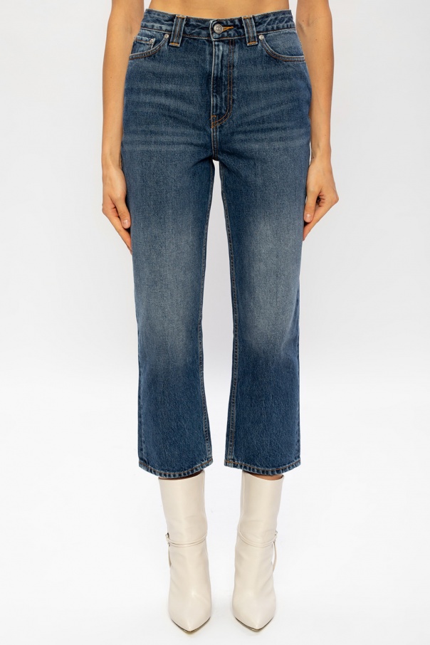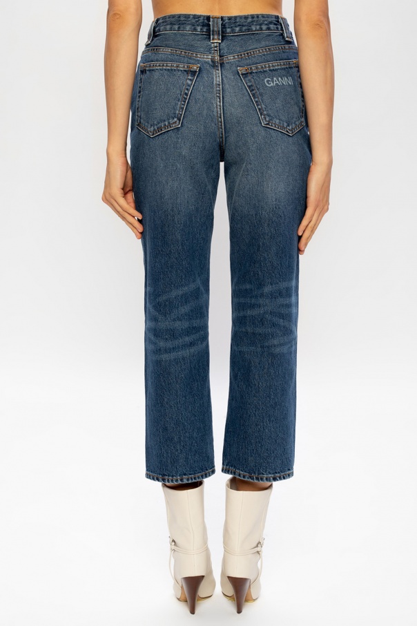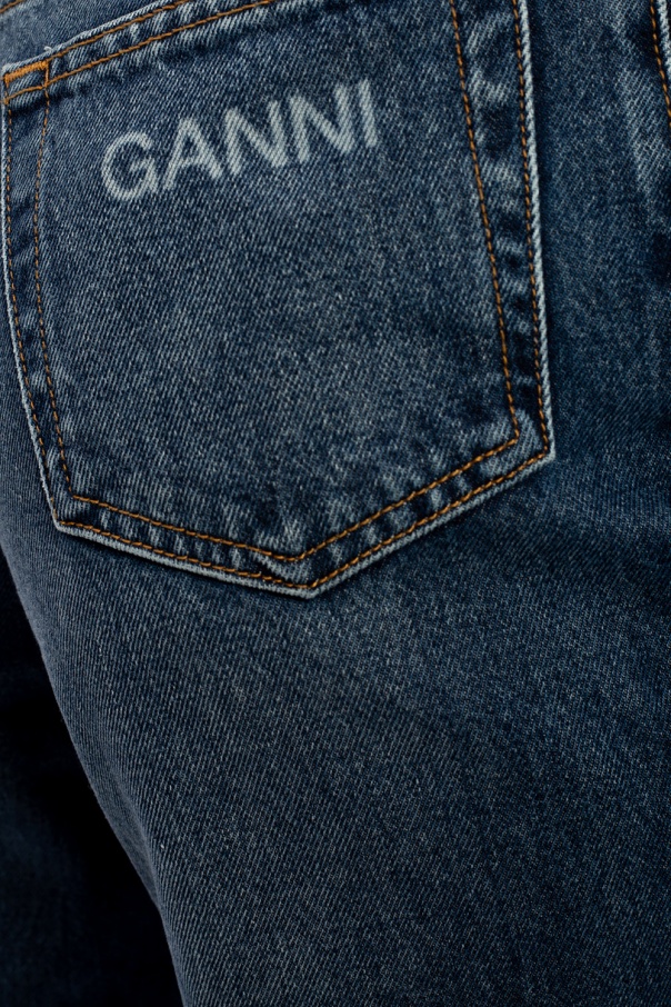 Navy blue jeans from Ganni. Printed with the brand\'s logo, this pair features classic 5-pocket design with zip fly and button fastening.