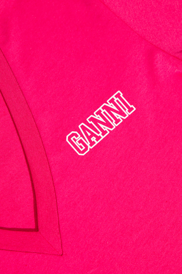Pink T-shirt from Ganni. Made of recycled fabric, this short sleeve design features a printed logo pattern in white and ribbed V-neck.