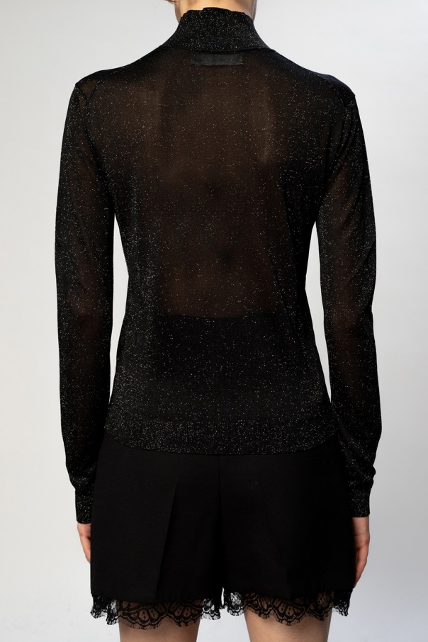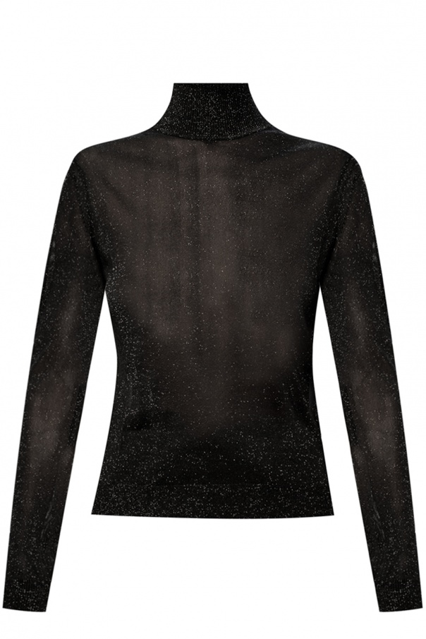 Black turtleneck sweater from Samsoe Samsoe. This long sleeve design is inlaid with a silver-tone lurex fiber.