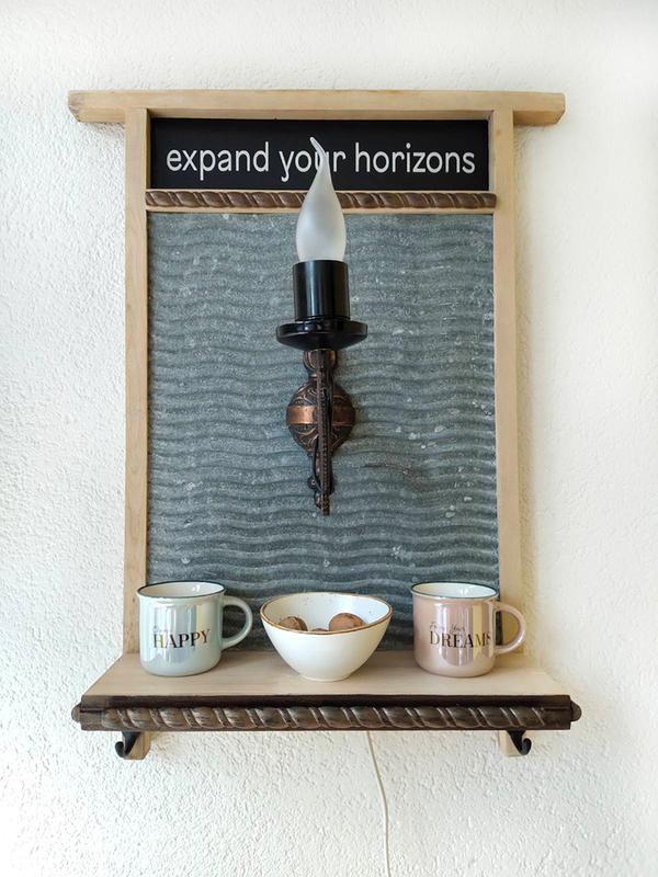 Эксклюзивная вещь, имеющая несколько приятных функций. Панно предназначено для кухонь, санузлов, либо для любого тематического интерьерного уголка, где требуется подсветка и дополнительная полка с крючками. Имеет две крепежных петли в качестве подвеса для стены. Также имеет два варианта подключения: либо через розетку, либо подключение через выключатель. Бра имеет стандартный тип патрона. Продается с работающей лампочкой. Замеры полотна: высота - 64 см., ширина (центральная часть, без учета верхнего бортика) - 38 см., глубина полки - 12 см., выступ светильника от панели - 23 см.