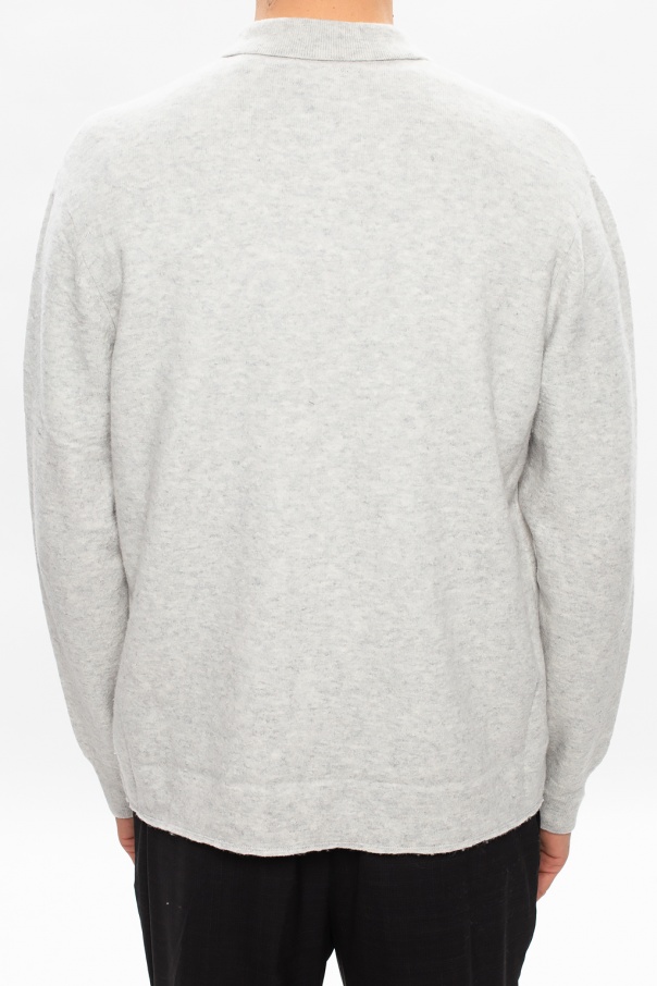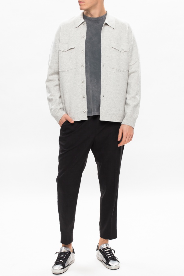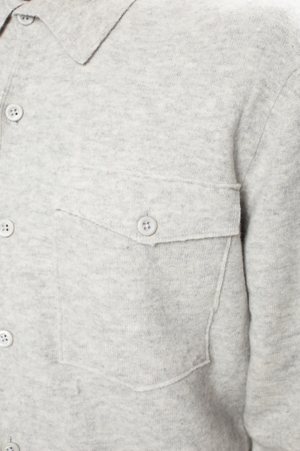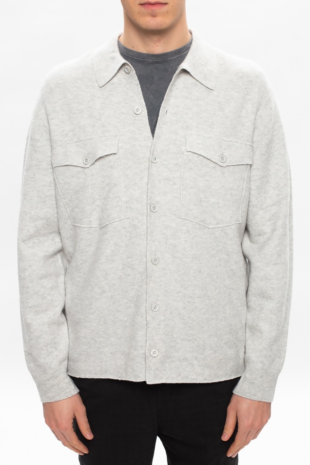Grey 'Lori' cardigan from AllSaints. Knitted from wool, this style fastens via buttons and employs two button-fastened flapped pockets on the front and long sleeves with elasticated cuffs.