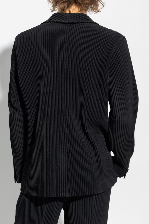 Black blazer from Issey Miyake Homme Plisse. Crafted from recycled material, this style fastens with buttons and features notch lapels, two slip pockets, a single back vent and long sleeves with button cuffs.
