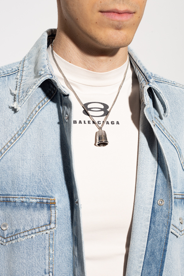 Silver-tone necklace from Balenciaga. Made of bronze and brass, this item features a logo-engraved thimble charm and adjustable lobster clasp closure.