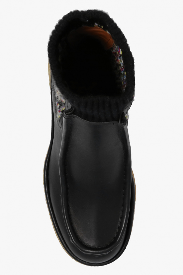 Black ‘Jamie’ heeled ankle boots from Chloe. Made from calf leather with a slip-on silhouette, this model sits on a beige rubber sole and features a distinctive trim on the front and a colourful sock-like cuff in an elasticized cashmere and wool blend.