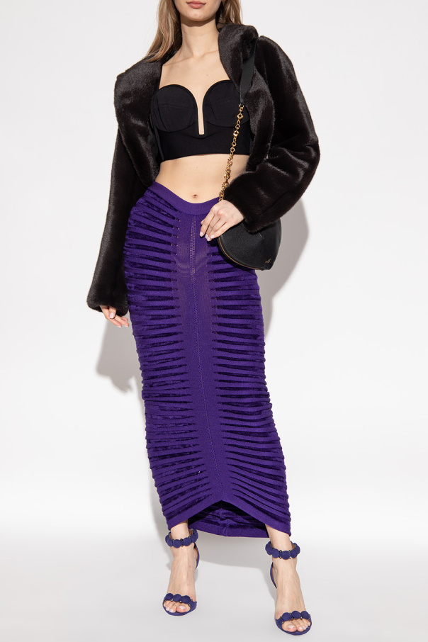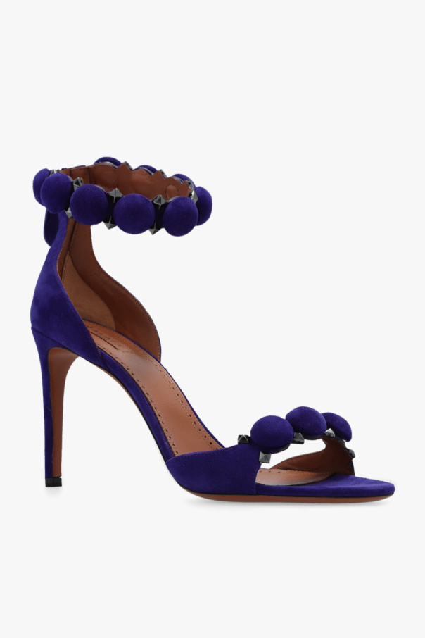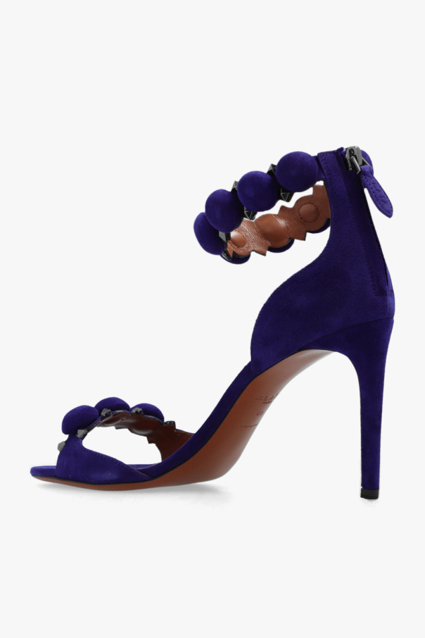 Purple ‘La Bombe’ sandals from Alaia. Made of leather, this pair features a back zip, raised detail, dark silver-tone studs and brown leather sole.