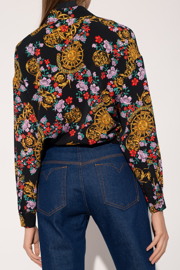 Black shirt from Versace Jeans Couture. Fastened with buttons. Decorated with a logo and a colorful \'Sun Flower Garland\' pattern. Sleeves finished with a cuff fastened with a button.