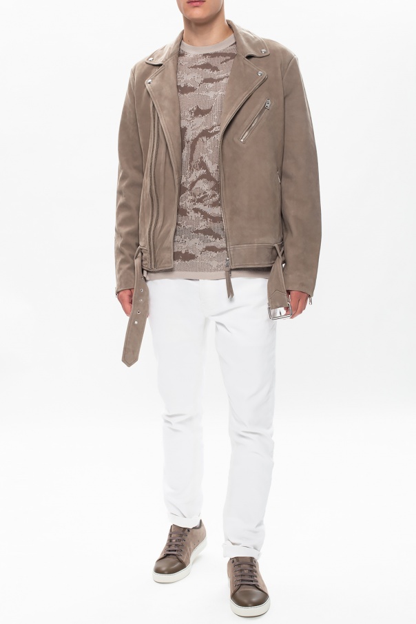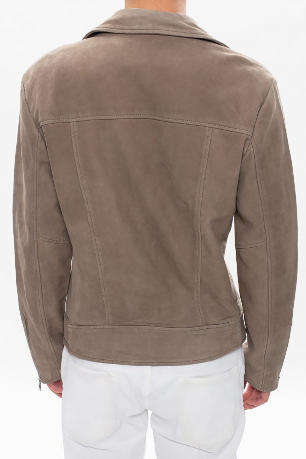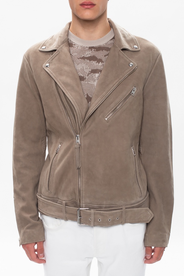 Grey ‘Inigo’ biker jacket from AllSaints. Crafted from suede, this garment features a two-way zip fastening, three zip pockets on the front, zips at the sleeves and a removable buckle belt.