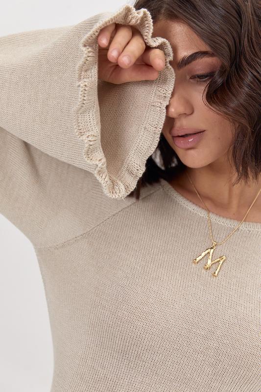 Низ сукні теж прикрашений в’язаними рюшами, які гармонійно перекликаються з деталями манжет. Завдяки цьому сукня виглядає одночасно урочисто й затишно.