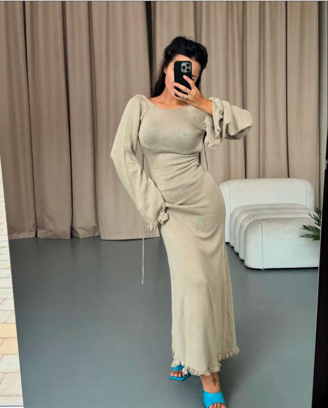 В’язана сукня максі з вирізом на спині — це витончене поєднання романтики й елегантності. Така сукня чудово підкреслює жіночність, додаючи образу легкості й грації.Модель має облягаючий верхній силует, який плавно переходить у розширений низ. Виріз на спині додає моделі спокусливості, створюючи витончений акцент. Зав'язується сукня ззаду на шнурівки. Довгі кльошні рукави надають образу нотку драматичності, а манжети з рюшами додають м’якості й романтичного шарму.