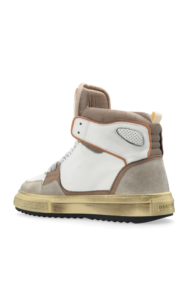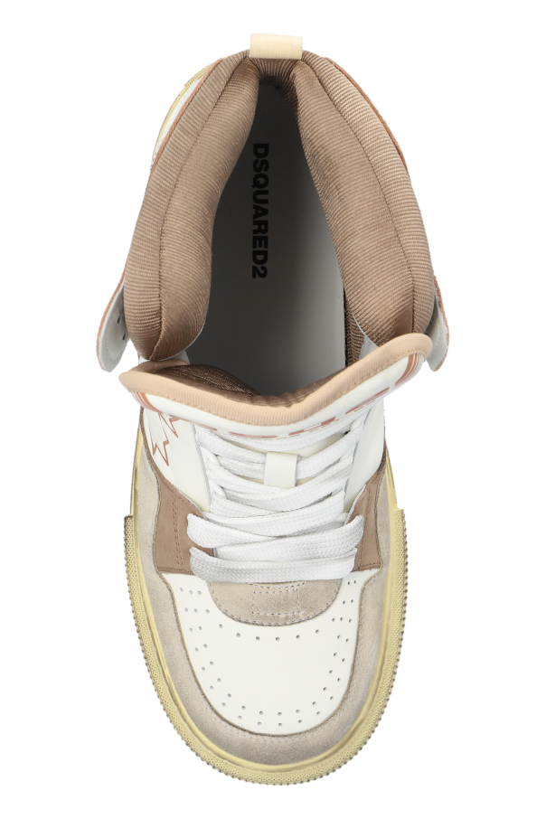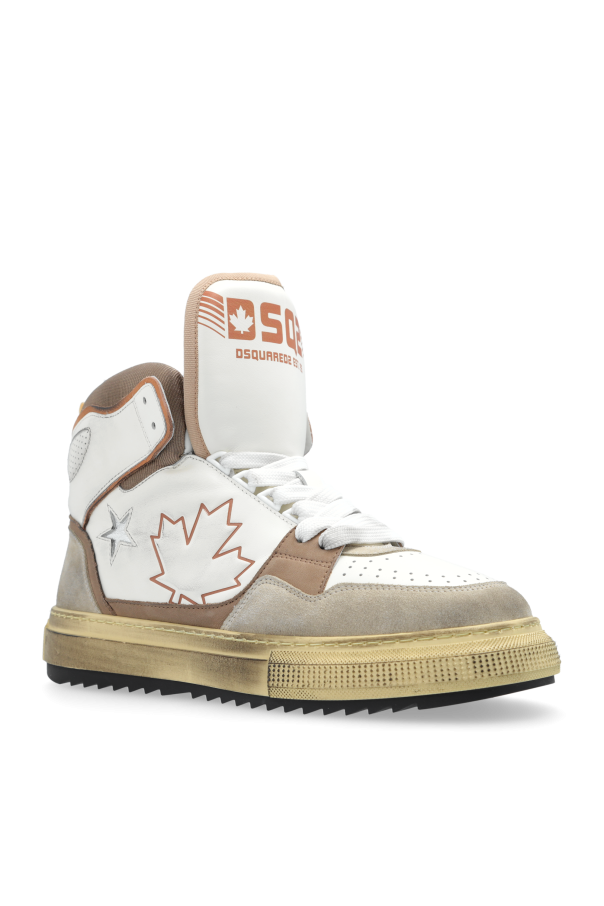 Introducing the Boogie high-top sneakers, an exquisite addition to the exclusive collection by the renowned designer Dsquared2. These sneakers epitomize a sophisticated blend of style and functionality, making them a quintessential choice for the discerning gentleman. Crafted from a harmonious amalgamation of premium leather, sumptuous suede, and durable fabric, the Boogie sneakers exude both elegance and resilience. The dominant beige, white, and brown hues are accentuated by an intricate red maple leaf embroidery on the side, a signature element of Dsquared2\'s design. Adorned with a bold \"DSQ2\" inscription on the tongue and a striking \"DSQUARED2 EST. 95\" logo, these sneakers make a statement of unparalleled luxury. The thick, gold-toned sole, embellished with a textured finish and a debossed \"DSQUARED2\" at the heel, ensures exceptional grip and style. Featuring classic white laces, a cushioned interior for enhanced comfort, and a convenient rear pull tab, these sneakers are as practical as they are stylish. The perforated front ensures superior ventilation, keeping your feet comfortable throughout the day. Why Choose These Sneakers? Exquisite design with premium leather, suede, and fabric. Distinctive red maple leaf embroidery for a unique touch. Bold logos and inscriptions that signify luxury. Comfortable and practical with cushioned interior and ventilation. Thick, gold-toned sole for excellent grip and durability.