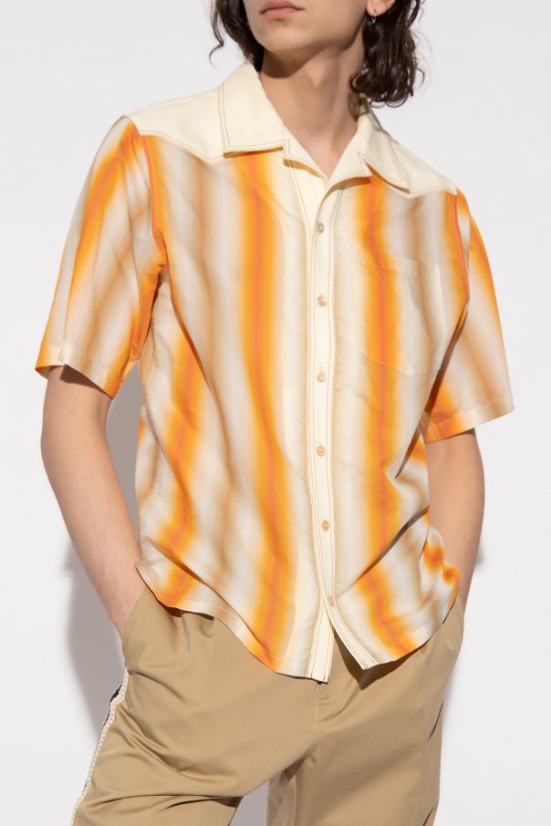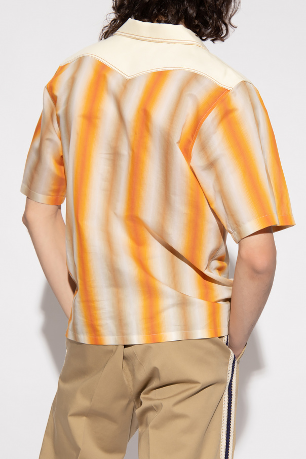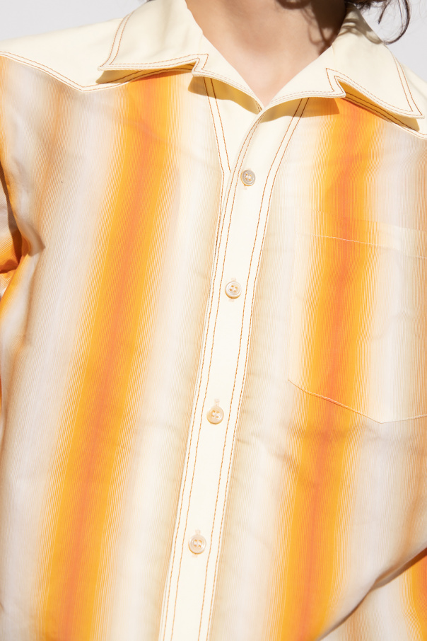 Cream, orange and brown ‘Sunrise’ shirt from Wales Bonner. Crafted from a cotton, silk and linen blend, this short sleeve design features a stripe pattern and front pocket.