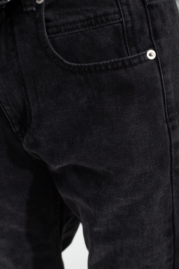 Black ‘Vendelia’ slim-fit jeans from Marant Etoile. Cut from washed cotton with a high-rise waist, this pair falls with tapered legs and features a zip fly with a button, classic five pockets, distressed details and a back logo patch.