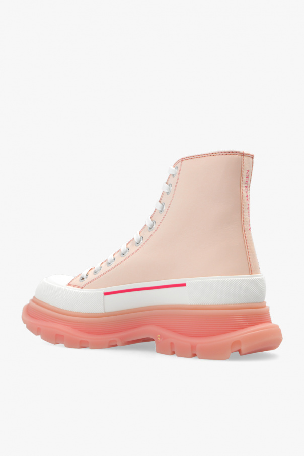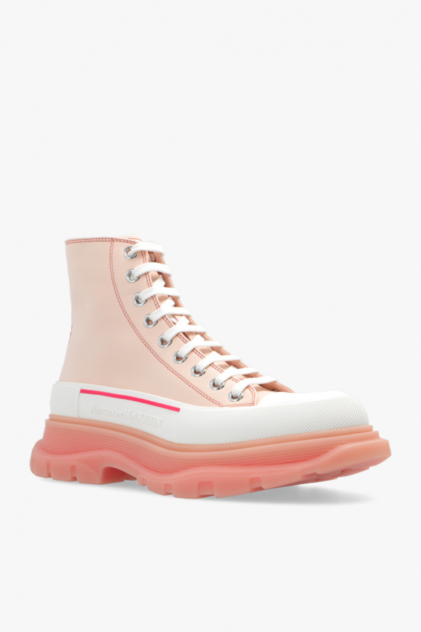 Light pink platform sneakers from Alexander McQueen. Crafted from calf leather, this lace-up pair features a logo detail, white rubber sole and pink rubber sole.
