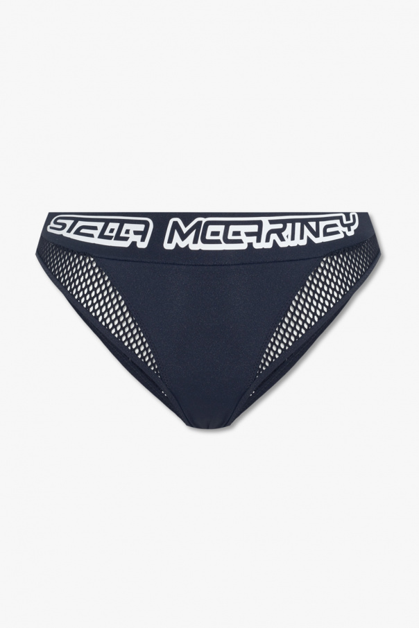 Black swimsuit bottom from Stella McCartney. Crafted in part from recycled materials, this style features a high-rise waist, sporty mesh trims, an elasticated waistband printed with a white logo and a gold-tone metal logo plaque at the back.