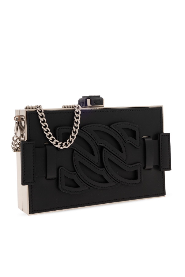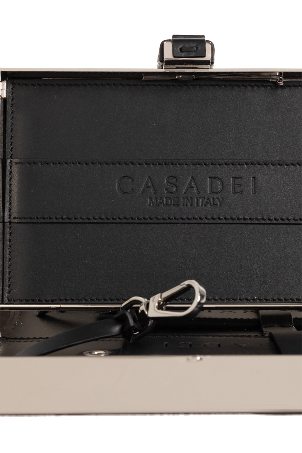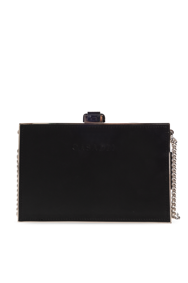 Black ‘Blade’clutch from Casadei. Made of leather, this design features a snap closure, monogram detail on the front, embossed logo at the back, silver-tone metal hardware and one internal compartment with one slip pocket and a detachable logo-embossed card holder with two card slots.