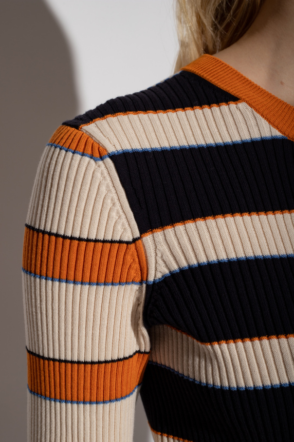 Blue, cream and orange crewneck sweater from PS Paul Smith. Crafted from a ribbed cotton knit, this style showcases a stripe pattern and a ribbed collar and cuffs.