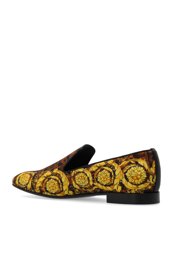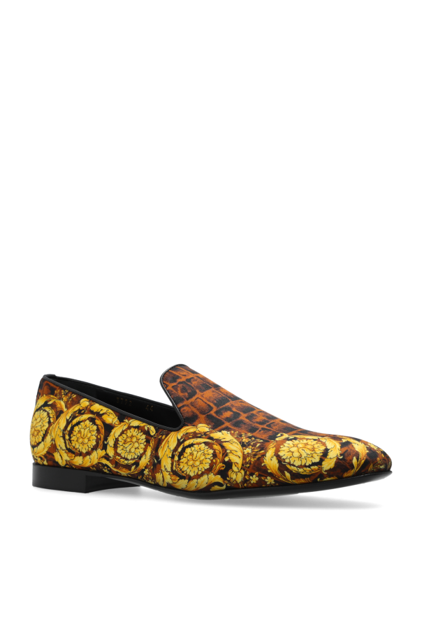 Black and brown slippers from Versace. Rendered in satin, this model sits on a black leather sole and showcases the brand\'s ‘Baroccodile’ print in yellow and orange.