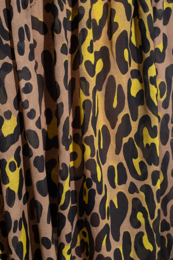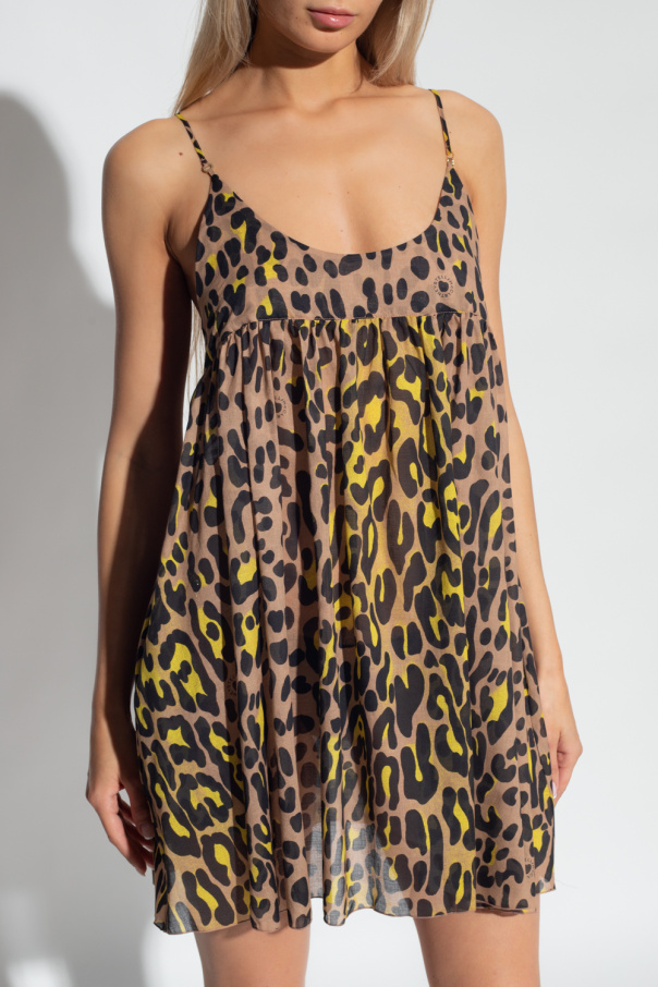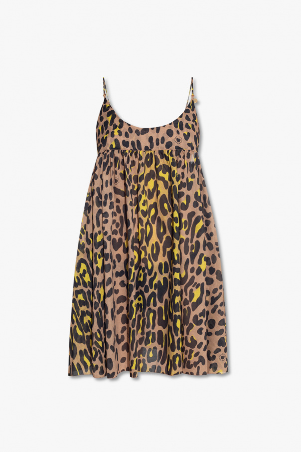 Brown and yellow beach dress from Stella McCartney. Crafted from organic cotton with a relaxed, cropped fit, this style is fitted at the waist and detailed with adjustable shoulder straps and a black animal pattern accompanied by a monogram motif and logo-engraved hardware at the back.