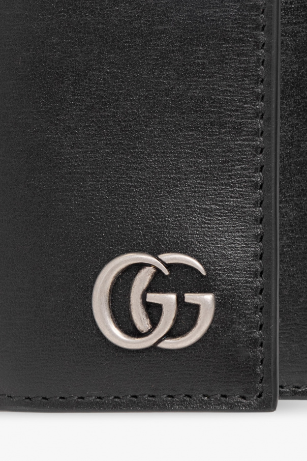 Black key holder from Gucci. Crafted from leather, this design secures with snaps and showcases silver-tone metal logo hardware and two slip pockets, one detachable keyring and six key hooks inside.
