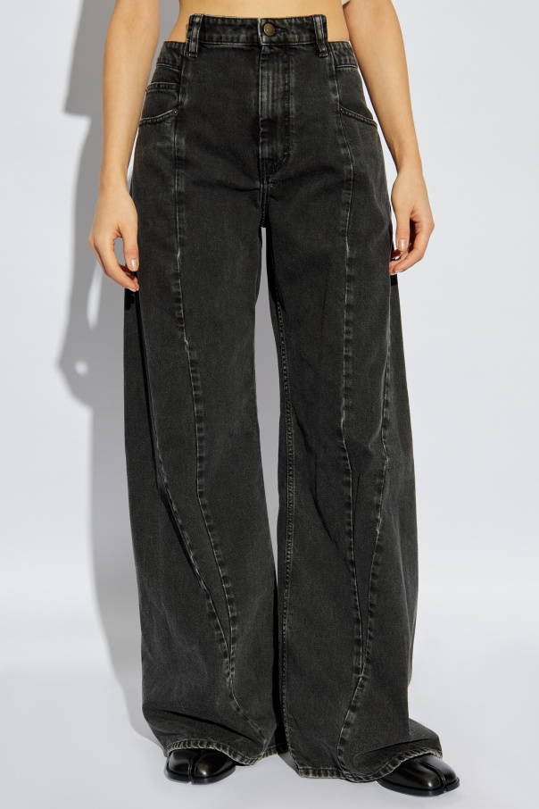 Introducing the Black Bootcut Jeans from the revered fashion house, Maison Margiela. These jeans epitomize the marriage of comfort and avant-garde design, exuding an air of effortless sophistication. Crafted from robust, thick denim, the jeans boast a wide bootcut silhouette that gracefully flares from the knee down. The classic pocket arrangement—two in the front and two at the back—alongside the meticulous stitching down the legs, accentuates their sartorial elegance. The deep black hue, subtly washed for a refined finish, pairs seamlessly with both casual and elegant ensembles. Fastened with a front zipper and button, these jeans are the quintessence of style and functionality, crafted entirely from pure cotton. Why Choose This Product? Exquisite Craftsmanship: Tailored by the illustrious Maison Margiela. Unique Design: Wide bootcut fit with signature stitching details. Premium Material: 100% cotton, ensuring durability and comfort. Versatile Style: Perfect for both casual and elevated looks.