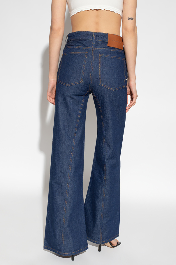 Navy blue jeans from Victoria Beckham. Falling with flared legs, this pair features a high-rise waist, a zip fly with a button, beige stitching details and classic five pockets.