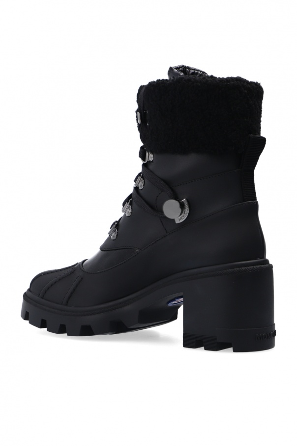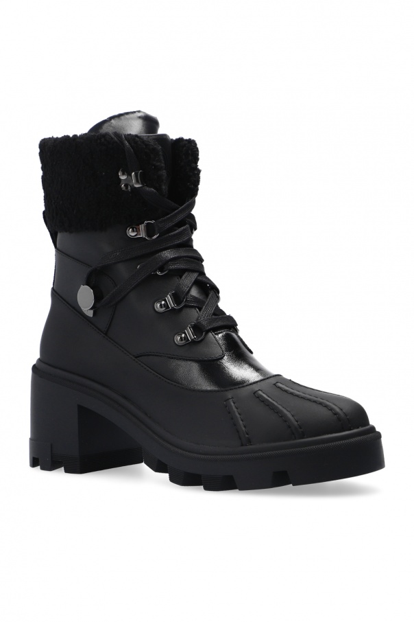 Black \'Corrine\' heeled ankle boots from Moncler. Crafted from leather and faux-fur, this lace-up pair is set on a robust black rubber sole and proudly presents stitching details and silver-tone logo metalware.