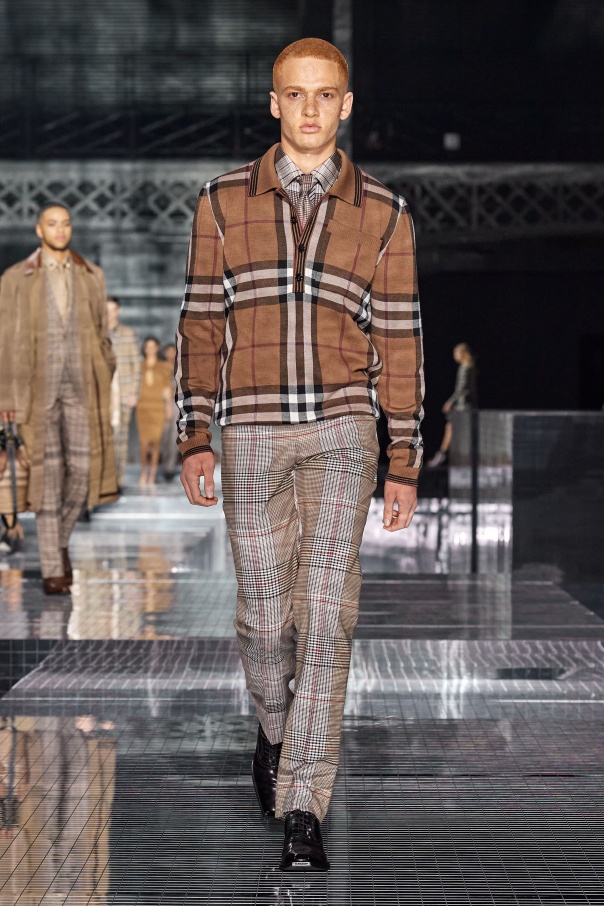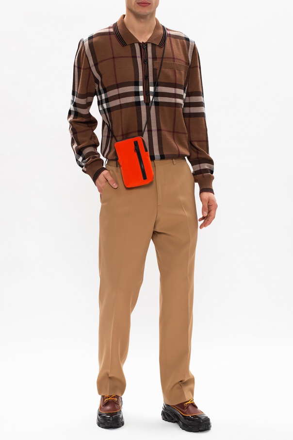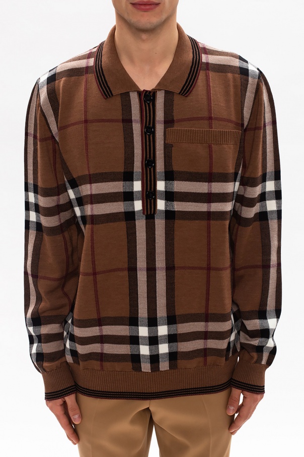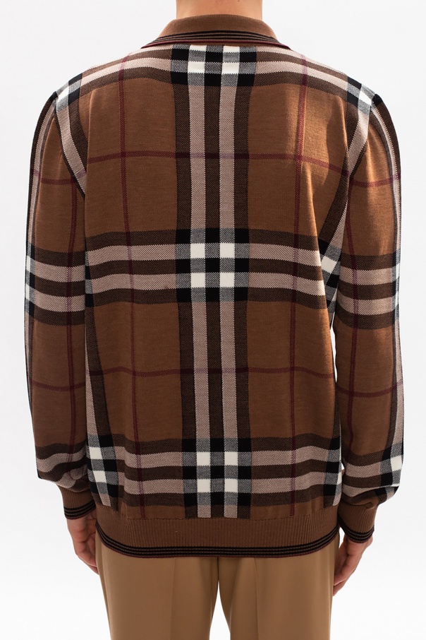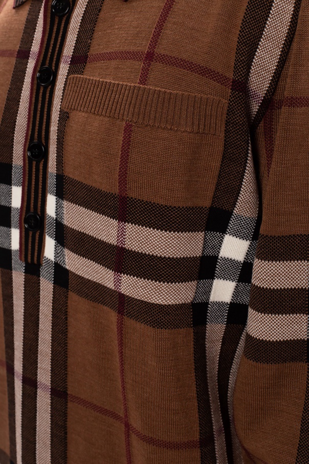 Brown sweater from Burberry. Knitted from wool with the brand's signature white, black and red check pattern, this jumper fastens via buttons and is complete with a slip frontal pocket and ribbed finishes at the bottom hem and cuffs.