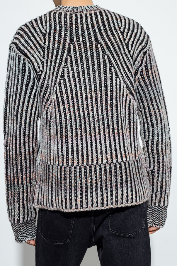 Black, grey and brown ‘K-Oakland’ sweater from Diesel. Crafted from a ribbed wool knit, this style features a stripe pattern, a white and black logo patch and elasticized trims on the standing collar and cuffs.