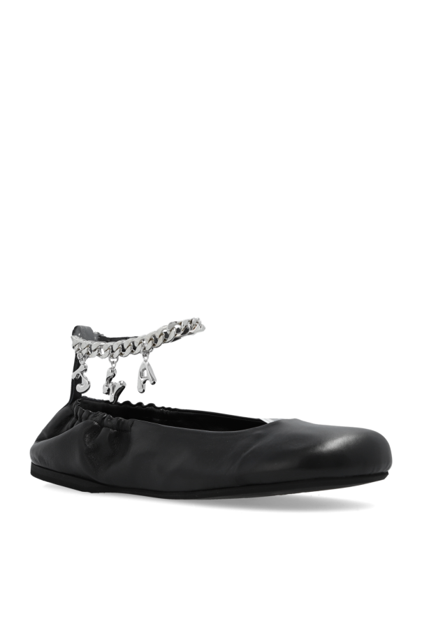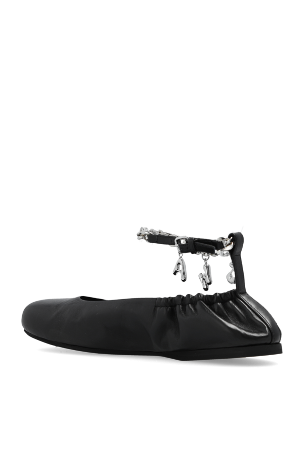 Black ballet flats from JW Anderson. Made of leather, this pair features an adjustable strap with chain inserts embellished with silver-tone logo charms and a black rubber sole.