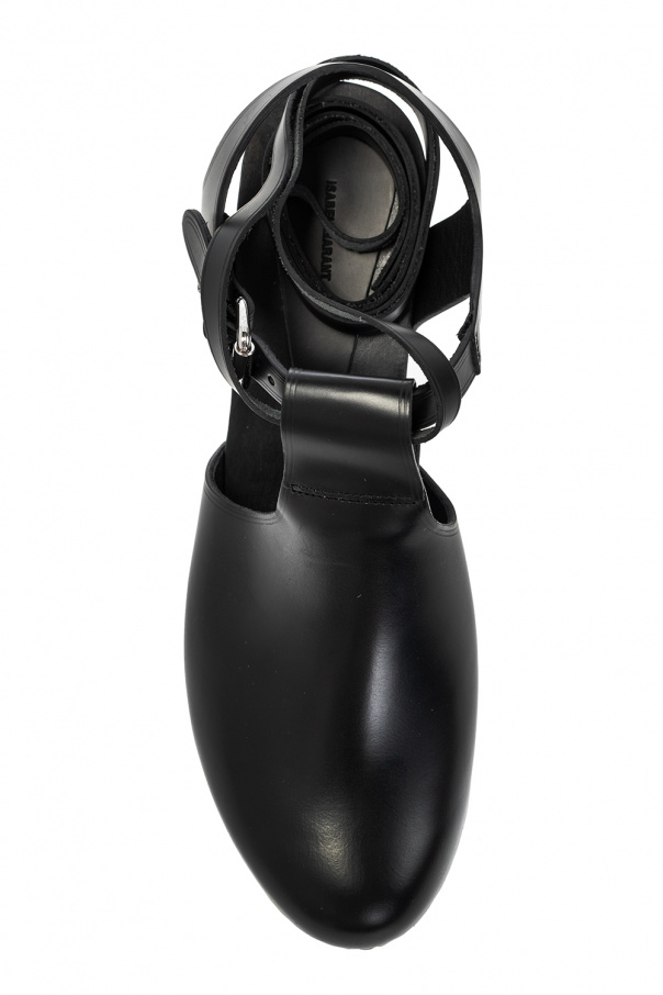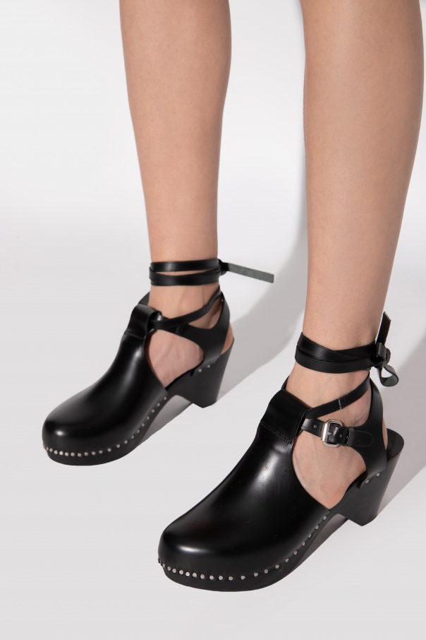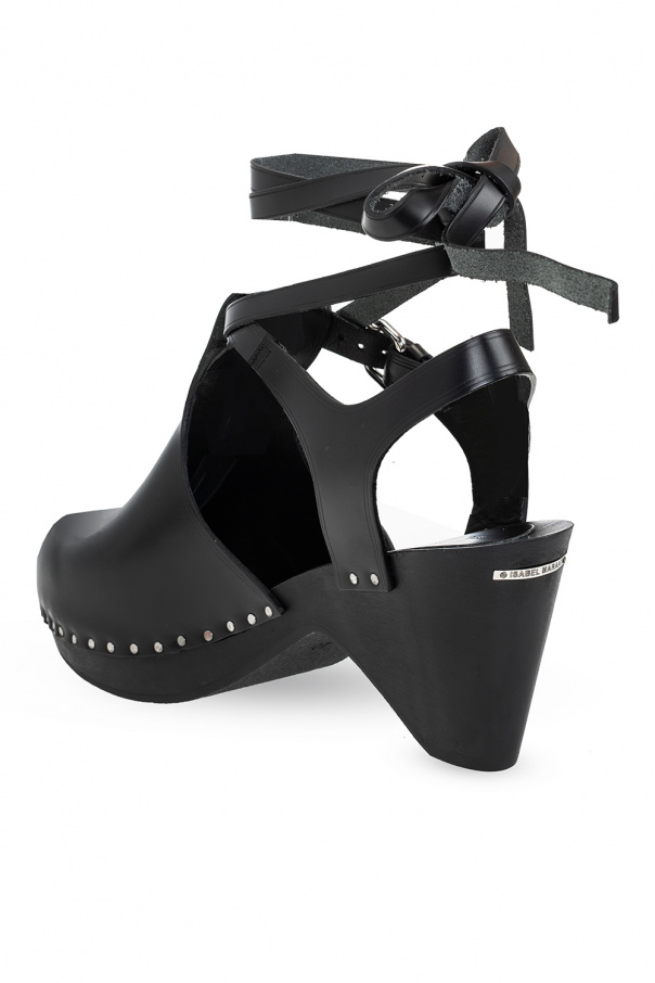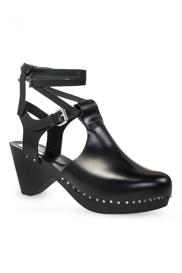 Black clogs from Isabel Marant. Crafted from calf leather, this model features an adjustable strap with a buckle, an ankle tie closure, cut-outs, silver-tone stud detailing, a wooden heel and a black rubber sole.